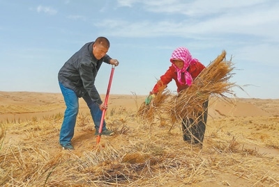 先做壓沙草方格。挖開方方正正的草方格,在四邊鋪上麥草,踩著鐵鍬,把麥草從間隙里壓進去……一次次重復,換來一排排麥草挺立,穩(wěn)住了片片流沙。