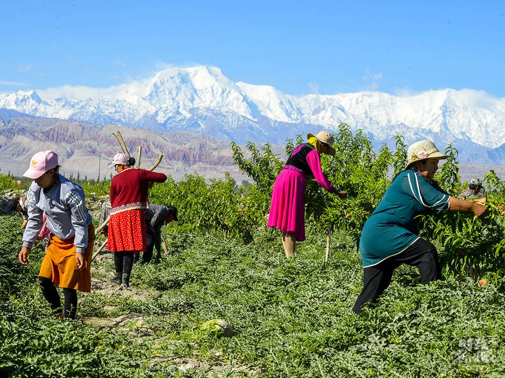 △新疆阿克陶縣村民在林果基地為桃樹打枝,林間同時(shí)套種了西瓜。