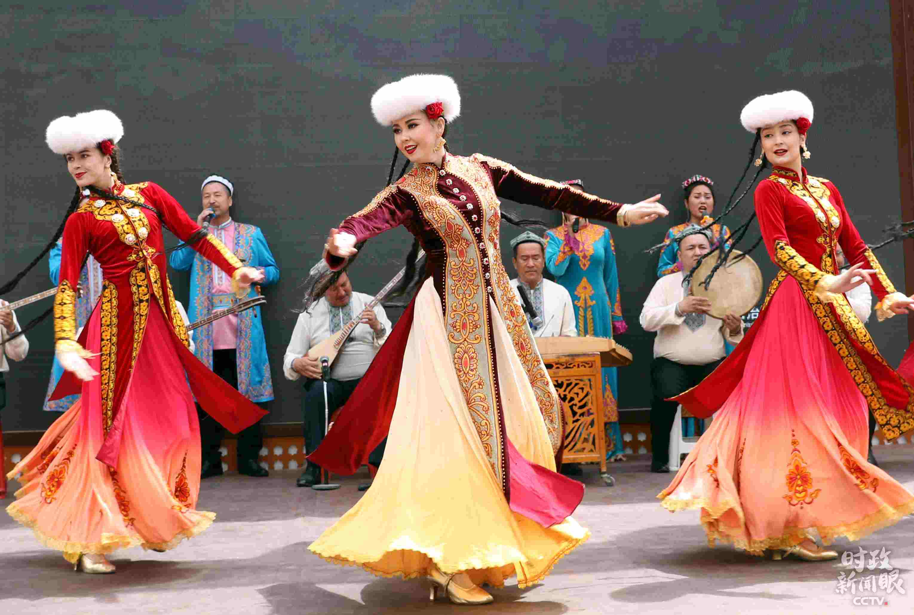 △烏魯木齊某景區(qū)演員表演新疆民族舞蹈。