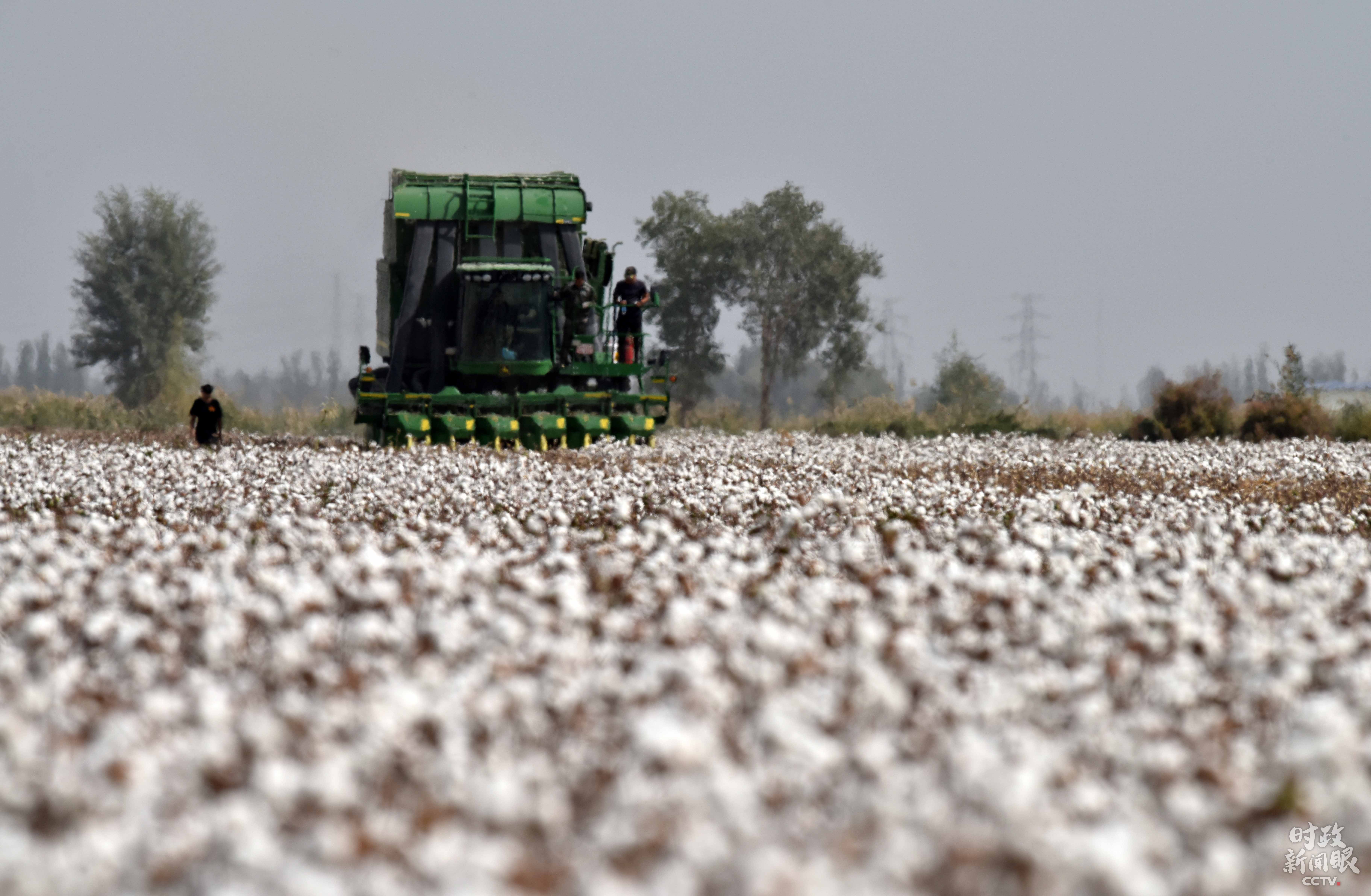 △新疆庫爾勒市普惠農(nóng)場內(nèi),大型采棉機(jī)正在采收棉花。