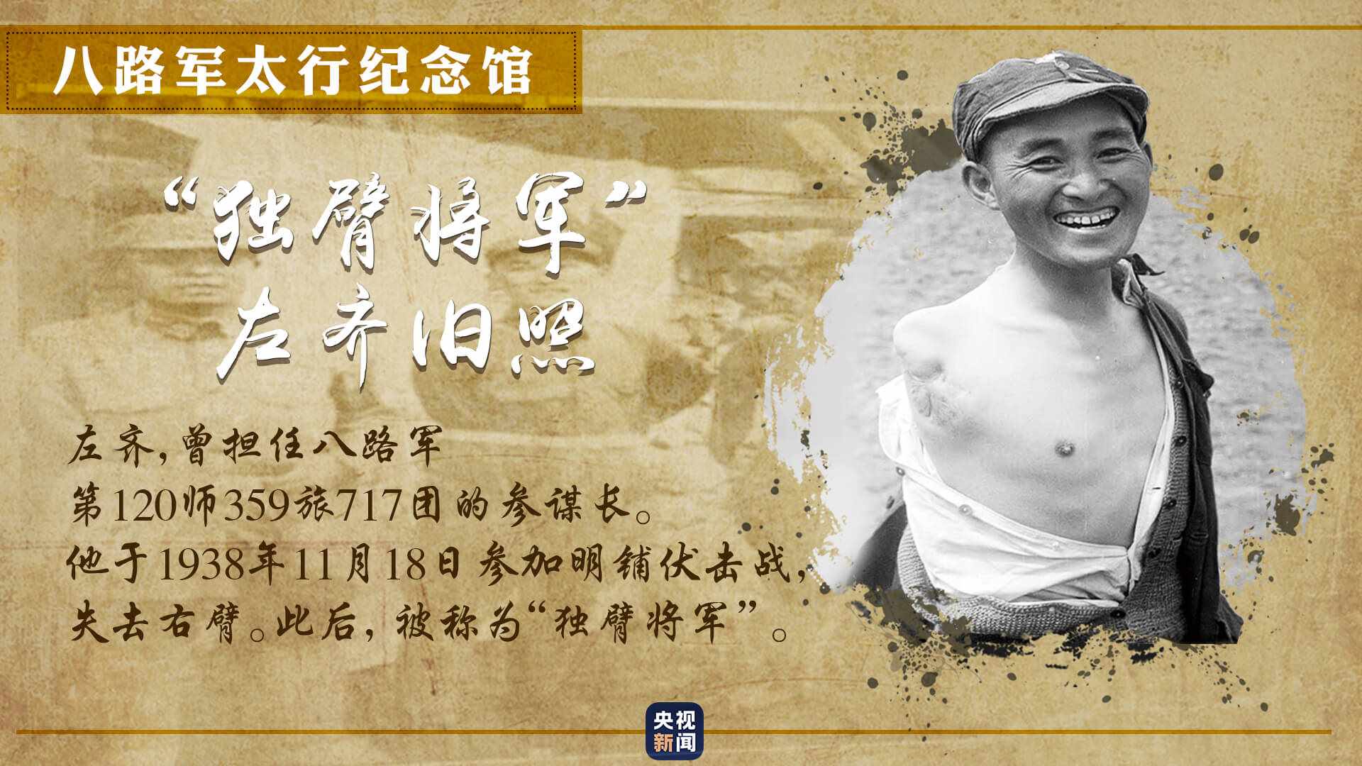 一張獨(dú)臂將軍的舊照,展現(xiàn)出八路軍為爭(zhēng)取民族獨(dú)立,不怕?tīng)奚?、不畏艱險(xiǎn)的革命英雄主義精神。