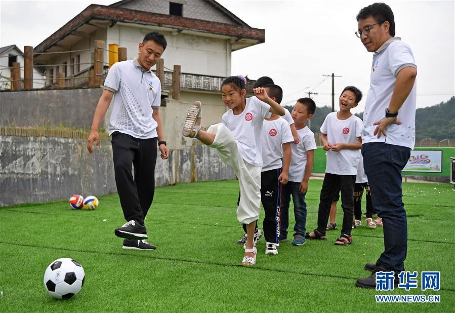 在江西省貴溪市金屯鎮(zhèn)金屯村渡坊村小組,志愿者和留守兒童一起進(jìn)行體育活動(dòng)(5月27日攝)。新華社記者萬(wàn)象攝