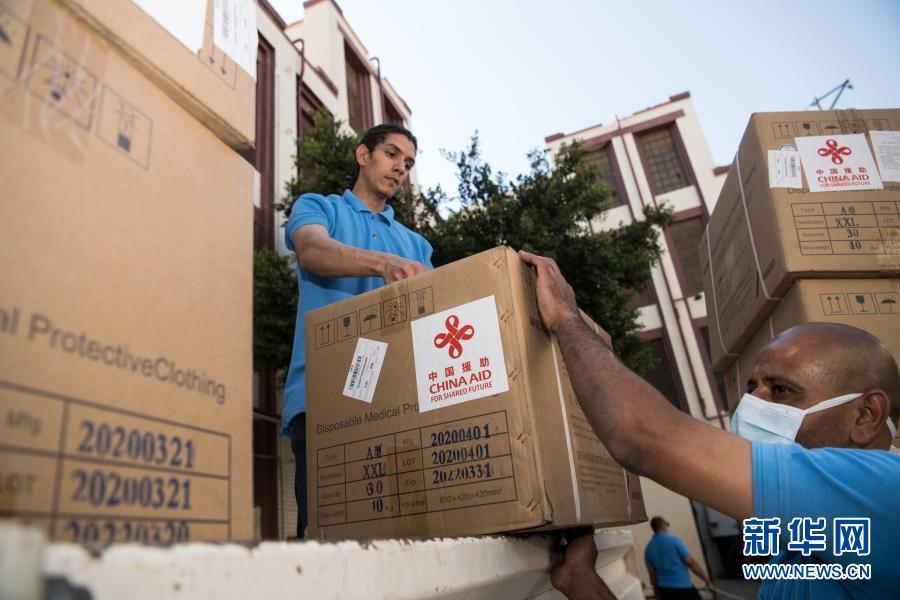 2020年5月10日,在埃及首都開(kāi)羅,工作人員搬運(yùn)中國(guó)政府援助的抗疫物資。新華社記者 鄔惠我 攝