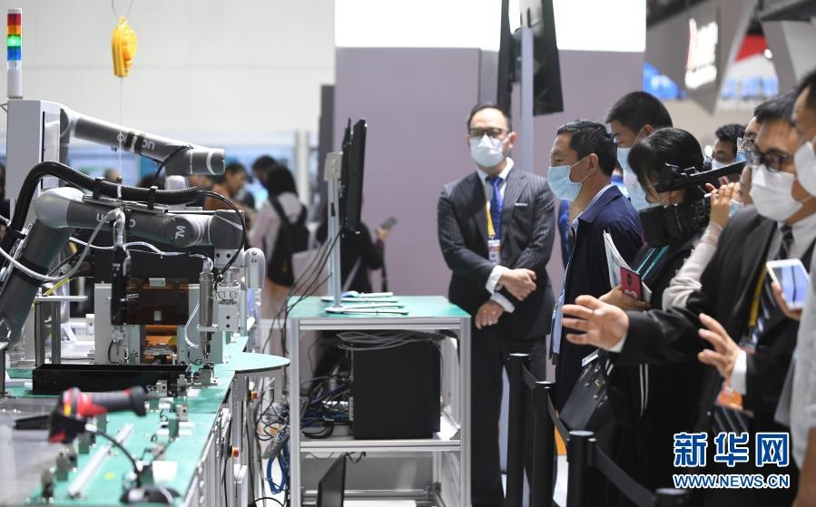 2020年11月6日,在進(jìn)博會(huì)技術(shù)裝備展區(qū),人們?cè)谖鏖T(mén)子展臺(tái)觀(guān)看人機(jī)協(xié)作的智能化單元生產(chǎn)線(xiàn)。新華社記者 李任滋 攝