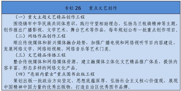 堅持以人民為中心的創(chuàng)作導向,創(chuàng)作生產(chǎn)出人民喜聞樂見的優(yōu)秀作品。繁榮發(fā)展新聞出版、廣播影視、文學藝術(shù),實施文藝作品質(zhì)量提升工程,加強優(yōu)秀劇本孵化和生活采風。推動重大主題文藝精品創(chuàng)作,加強現(xiàn)實題材創(chuàng)作生產(chǎn)。改進重點作品創(chuàng)作引導機制,建立重點文化藝術(shù)項目滾動扶持機制。設(shè)立內(nèi)蒙古文化藝術(shù)發(fā)展專項資金。加強文化文藝場館建設(shè)。制定文藝人才發(fā)展規(guī)劃,開展內(nèi)蒙古電影新導演計劃。實施文化潤心工程,以文藝創(chuàng)作鑄牢中華民族共同體意識。提升廣播電視和網(wǎng)絡(luò)視聽產(chǎn)品質(zhì)量,豐富網(wǎng)絡(luò)文藝內(nèi)容。搭建文藝精品遴選、展示、推出平臺,建設(shè)內(nèi)蒙古音樂廳,支持因地制宜建設(shè)綜合劇場、音樂廳和美術(shù)館,舉辦內(nèi)蒙古藝術(shù)節(jié)、內(nèi)蒙古音樂節(jié)等活動,大力實施文藝惠民演出和地方戲傳承創(chuàng)新工程,定期舉辦全區(qū)地方戲優(yōu)秀劇目展演以及音樂、舞蹈、小戲小品專業(yè)賽事,打造獨具特色的文化藝術(shù)品牌。