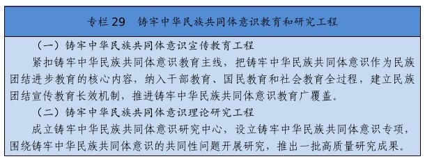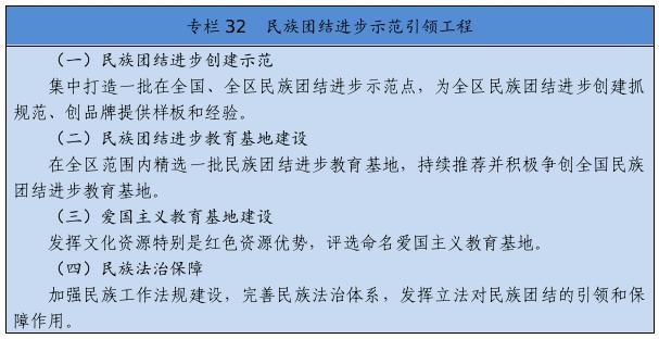 在全社會樹立和突出各民族共享的具有鮮明中華文化特征的文化符號和中華民族視覺形象,打造中國標志。堅定不移推廣普及國家通用語言文字,全面加強國家通用語言文字教育教學,積極穩(wěn)妥推行國家統(tǒng)編教材使用,深化雙語教學模式改革,確保少數(shù)民族學生掌握和使用國家通用語言文字。尊重、支持各少數(shù)民族語言文字的學習和使用。堅持以社會主義先進文化為引領(lǐng),促進各民族文化交融、創(chuàng)新。提倡文明現(xiàn)代的生活方式,引導和幫助各族群眾追求現(xiàn)代文明生活,推進民族進步。強化全體公民日常行為規(guī)范,完善市民公約、鄉(xiāng)規(guī)民約、學生守則、行業(yè)規(guī)章、職業(yè)規(guī)則、團體章程,營造自覺遵法守法、尊重少數(shù)民族風俗習慣和宗教信仰、維護民族團結(jié)的社會氛圍。著力開展興邊富民行動,打牢守邊固邊的民族團結(jié)基礎(chǔ)。