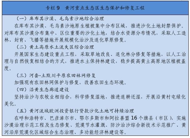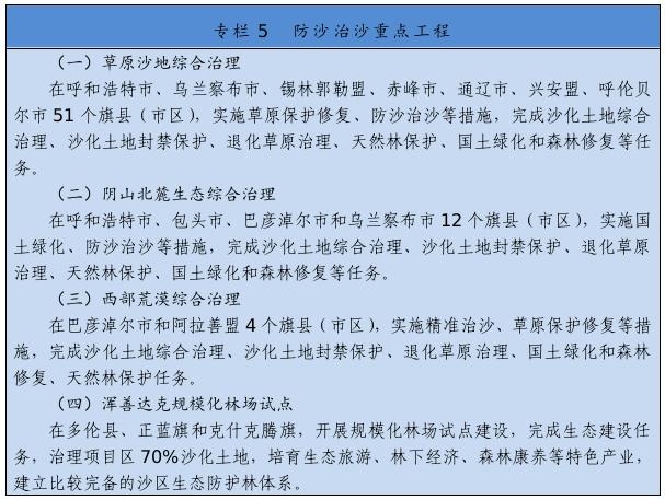 繼續(xù)實施京津風沙源治理等重點工程,推廣庫布其沙漠治理方式和沙產(chǎn)業(yè)模式,推動渾善達克、烏珠穆沁、呼倫貝爾沙地治理。推進規(guī)?;謭鼋ㄔO(shè),采取人工造林、封沙育林、飛播造林等方式恢復植被。建設(shè)荒漠綠洲防護林、防風固沙林、沙漠鎖邊林、農(nóng)田草牧場防護林以及水土保持林。以干旱半干旱草原為重點,加強草場改良和人工種草,實行圍封禁牧、劃區(qū)輪牧、季節(jié)性休牧、舍飼圈養(yǎng)等措施,保護和恢復草原植被。以內(nèi)蒙古高原等為重點,推進防護林體系建設(shè)及退化林修復、退化草原修復、京津風沙源治理。新增水土流失綜合治理3.33萬平方公里。