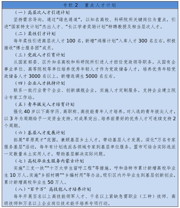 著力抓好高層次創(chuàng)新型領(lǐng)軍人才、青年拔尖人才、高技能人才、各類急需緊缺人才隊伍建設(shè)。實施人才工程計劃,選拔推薦全國杰出專業(yè)技術(shù)人才、政府特殊津貼專家、國家百千萬人才工程人選,組織評選自治區(qū)杰出人才獎、突出貢獻專家、青年創(chuàng)新人才獎,選拔培養(yǎng)自治區(qū)“草原英才”工程、新世紀321人才工程、511人才培養(yǎng)工程人選。實施專業(yè)技術(shù)人才知識更新工程。加強基層專業(yè)技術(shù)人才隊伍建設(shè),引導人才向基層一線和艱苦地區(qū)流動。實施“百千萬”高技能人才培養(yǎng)計劃。