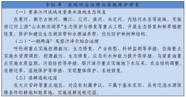 大力推進黃河生態(tài)帶建設(shè),統(tǒng)籌水環(huán)境、水生態(tài)、水資源、水安全、水文化,推進干支流一體化治理,突出抓好十大孔兌、多沙粗砂區(qū)集中來源區(qū)等水土保持治理,實施河道和灘區(qū)綜合提升治理工程,完善水沙調(diào)控機制。深化“一湖兩?!奔安旌鼓谞柹鷳B(tài)環(huán)境綜合治理,創(chuàng)新區(qū)域系統(tǒng)治理和流域整體治理舉措,逐步改善生態(tài)環(huán)境。全面加強嫩江、遼河、內(nèi)陸河水系等流域和達里諾爾、烏拉蓋等濕地生態(tài)保護修復,深入開展地下水超采綜合治理。