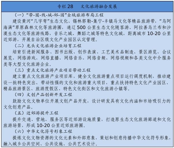 跨盟市打造大景區(qū),跨區(qū)域布設(shè)“黃金線”,建設(shè)以生態(tài)為底色、以文化為特色、以旅游為產(chǎn)業(yè)支撐的“帶-圈-線-城-郊-園”文旅融合發(fā)展格局。創(chuàng)建全域旅游示范區(qū),推動東中西部旅游業(yè)差異化協(xié)調(diào)發(fā)展,東部地區(qū)重點推進生態(tài)旅游、邊境旅游、冰雪旅游提檔升級,打造呼倫貝爾國內(nèi)一流草原森林生態(tài)和邊境旅游目的地;中部地區(qū)重點發(fā)展文化遺產(chǎn)、草原風情、健康體育和休閑度假,打造呼和浩特現(xiàn)代休閑與會展旅游中心、鄂爾多斯文化體驗和休閑旅游目的地;西部地區(qū)推動發(fā)展特色生態(tài)旅游、沙漠休閑和自駕越野,打造阿拉善國內(nèi)知名西部風情旅游區(qū)。豐富創(chuàng)新高品質(zhì)文化旅游產(chǎn)品供給,積極發(fā)展中高端旅游,提供個性化定制服務(wù),大力發(fā)展紅色旅游、馬文化旅游、康養(yǎng)旅游、研學旅游、體育旅游、邊境旅游和刺繡產(chǎn)業(yè)。推動旅游景區(qū)提檔升級,開展文化演藝、非遺和文創(chuàng)產(chǎn)品進景區(qū)活動,加快建設(shè)智慧旅游景區(qū)、跨境旅游試驗區(qū)。創(chuàng)建鄉(xiāng)村旅游重點村,培育鄉(xiāng)村旅游融合發(fā)展示范區(qū)。完善旅游公共服務(wù)設(shè)施,提升旅游咨詢中心、公共停車場、旅游廁所等服務(wù)功能。統(tǒng)籌“風景道+景區(qū)+鄉(xiāng)村+自駕車營地”,建立健全自駕游服務(wù)體系。整合利用公路、高鐵和航空網(wǎng)絡(luò),構(gòu)建安全便捷的全域旅游交通體系。實施文化和旅游品牌戰(zhàn)略,統(tǒng)籌做好旅游營銷。實施文化旅游資源開發(fā)利用工程,組織開展全區(qū)文化和旅游資源普查,建立文化和旅游資源數(shù)據(jù)庫。