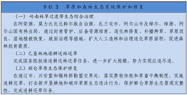 把保護草原、森林作為首要任務(wù),嚴格執(zhí)行基本草原保護制度,落實草原生態(tài)保護補助獎勵政策,完善草畜平衡和草原禁牧休牧制度。嚴禁在草原上亂采濫挖、新上礦產(chǎn)資源開發(fā)等工業(yè)項目,已批準在建運營的礦山、風電、光伏等項目到期退出,新建風電、光伏電站重點布局在沙漠荒漠、采煤沉陷區(qū)、露天礦排土場,推廣“光伏+生態(tài)治理”基地建設(shè)模式。開展草原生態(tài)承載能力核定和草原生態(tài)系統(tǒng)健康評價,實施草原保護和修復重大工程??茖W開展大規(guī)模國土綠化行動,實施三北防護林體系建設(shè)、公益林保護、森林質(zhì)量精準提升等工程,探索大興安嶺一體化保護模式,推進已墾森林草原退耕還林還草,加強森林撫育和退化林修復,提升生態(tài)系統(tǒng)質(zhì)量和穩(wěn)定性。加快構(gòu)建以國家公園為主體的自然保護地體系。