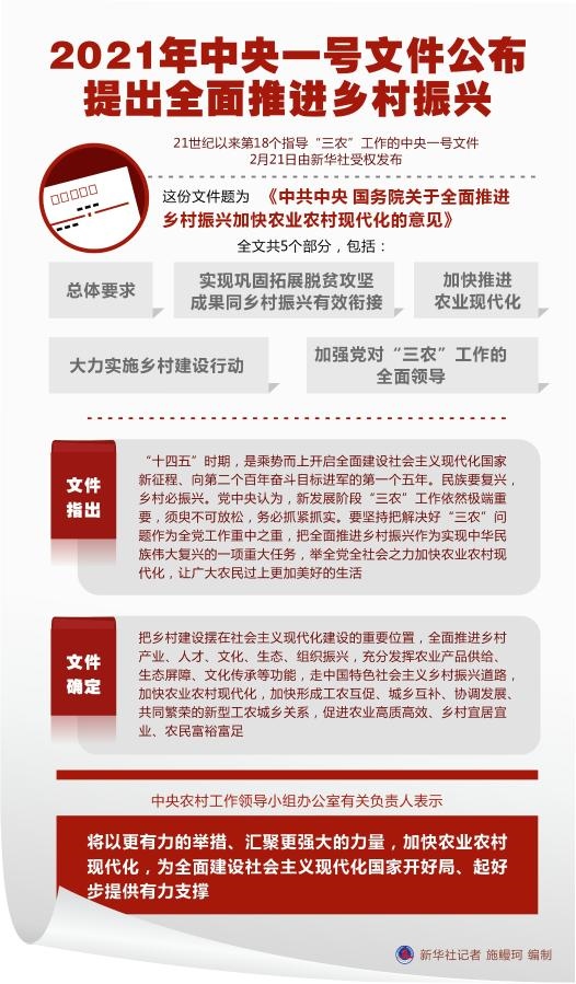 新華社北京2月21日電(記者胡璐、于文靜)21世紀以來第18個指導“三農(nóng)”工作的中央一號文件21日由新華社受權(quán)發(fā)布。