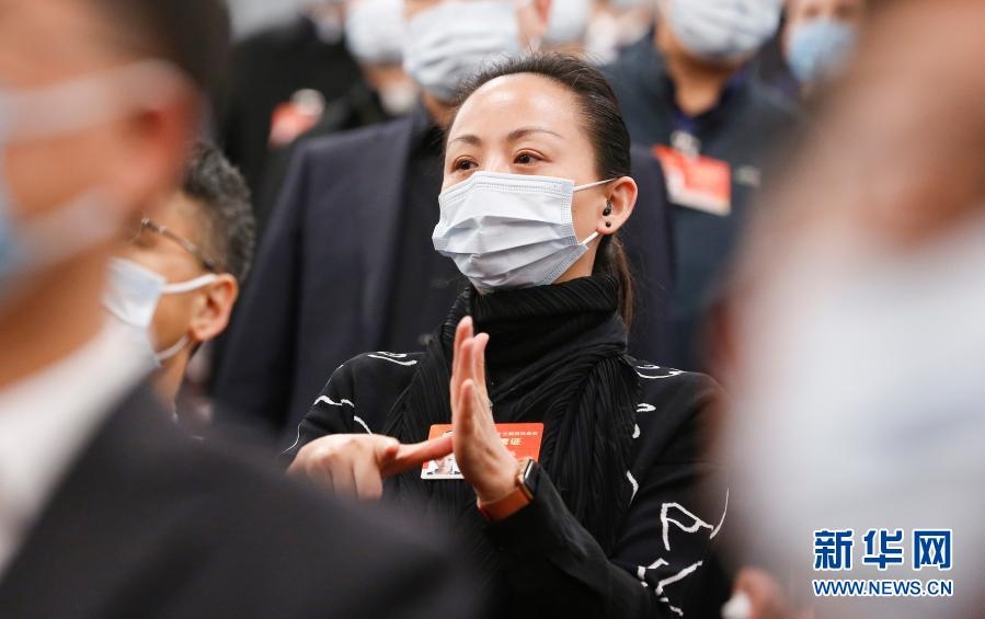3月5日,第十三屆全國人民代表大會(huì)第四次會(huì)議在北京人民大會(huì)堂開幕。這是列席大會(huì)的全國政協(xié)委員、中國殘疾人藝術(shù)團(tuán)團(tuán)長邰麗華用手語“唱”國歌。新華社記者 張玉薇 攝