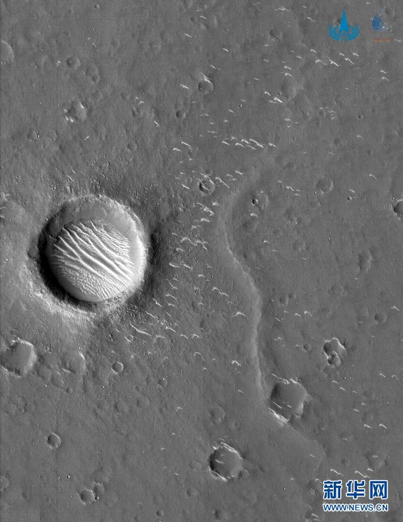 2021年2月5日20時,天問一號探測器發(fā)動機(jī)點(diǎn)火工作,順利完成地火轉(zhuǎn)移段第四次軌道中途修正,以確保按計(jì)劃實(shí)施火星捕獲。國家航天局同步公布了天問一號此前在距離火星約220萬公里處獲取的首幅火星圖像。新華社發(fā)