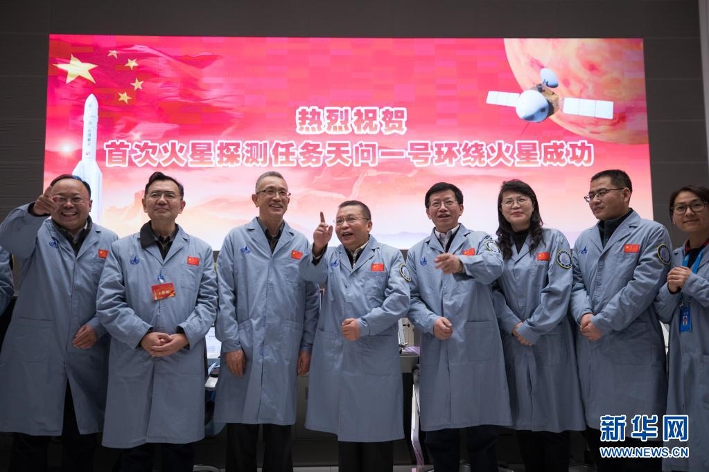 2021年2月10日,在北京航天飛行控制中心指揮大廳,航天科研人員慶祝我國首次火星探測任務(wù)天問一號環(huán)繞火星成功。新華社記者 金立旺 攝