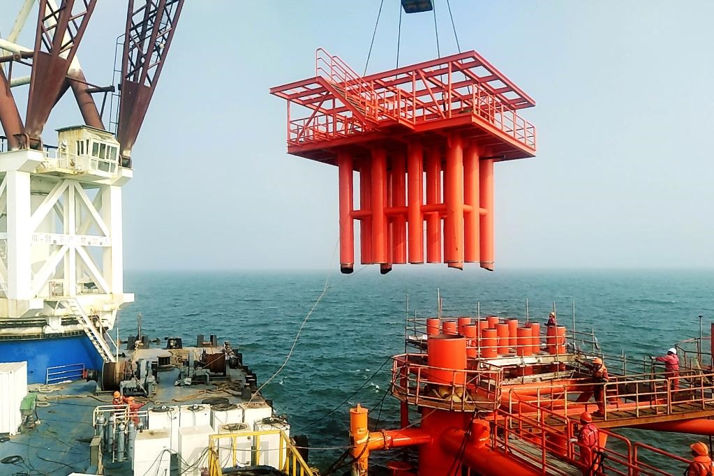 2021年8月21日,中國石化勝利油田海上新建產(chǎn)能項(xiàng)目埕北208井口平臺吊裝安全就位。(勝利油田供圖)