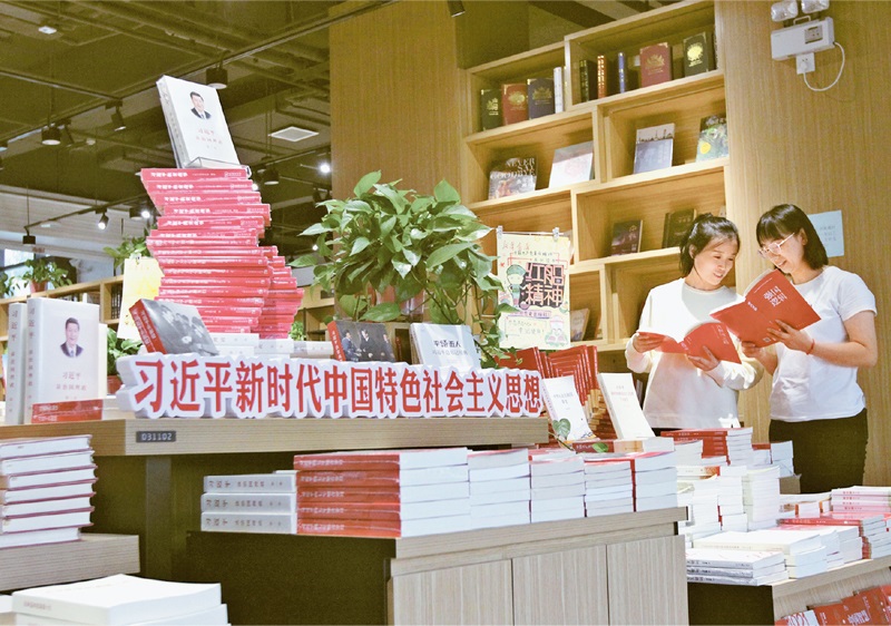 黨確立習(xí)近平同志黨中央的核心、全黨的核心地位,確立習(xí)近平新時(shí)代中國(guó)特色社會(huì)主義思想的指導(dǎo)地位,反映了全黨全軍全國(guó)各族人民共同心愿,對(duì)新時(shí)代黨和國(guó)家事業(yè)發(fā)展、對(duì)推進(jìn)中華民族偉大復(fù)興歷史進(jìn)程具有決定性意義。圖為2021年10月4日,河南省焦作市博愛縣新華書店里,讀者在閱讀習(xí)近平新時(shí)代中國(guó)特色社會(huì)主義思想相關(guān)書籍?!≈行律绨l(fā) 程全/攝