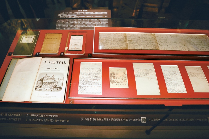 中國(guó)共產(chǎn)黨歷史展覽館的展廳里,陳列著多份珍貴的馬克思手稿。右上為馬克思《布魯塞爾筆記》第四筆記本手稿;右下為馬克思寫給《資本論》法文版出版人的六封書信。 中新社發(fā) 陳曉根/攝