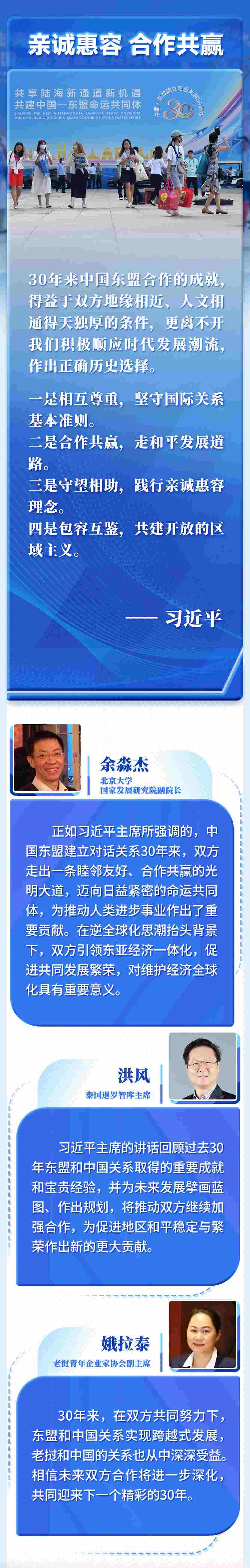中國東盟建立對話關系30年來,走過了不平凡的歷程。這30年,是經(jīng)濟全球化深入發(fā)展、國際格局深刻演變的30年,是中國和東盟把握時代機遇、實現(xiàn)雙方關系跨越式發(fā)展的30年。我們擺脫冷戰(zhàn)陰霾,共同維護地區(qū)穩(wěn)定。我們引領東亞經(jīng)濟一體化,促進共同發(fā)展繁榮,讓20多億民眾過上了更好生活。我們走出一條睦鄰友好、合作共贏的光明大道,邁向日益緊密的命運共同體,為推動人類進步事業(yè)作出了重要貢獻。