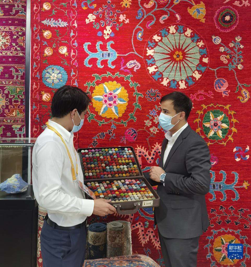 11月5日,阿富汗參展商阿里·法伊茲(右)在第四屆進(jìn)博會(huì)阿富汗手工羊毛地毯展臺(tái)忙碌。新華社記者吳宇攝