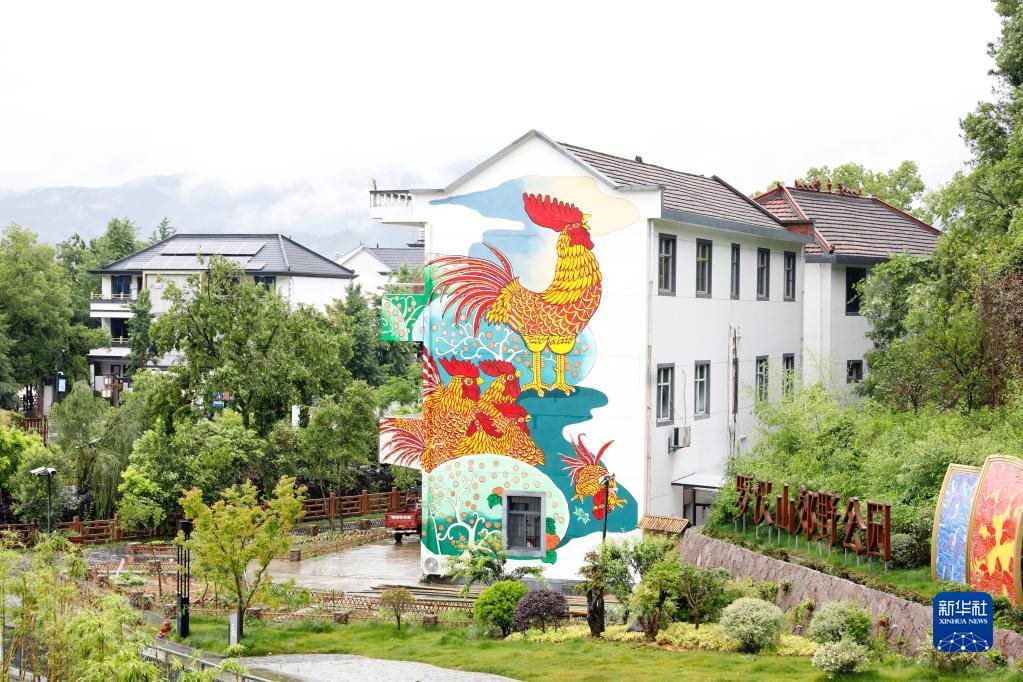 這是浙江衢州市柯城區(qū)溝溪鄉(xiāng)余東村建筑墻壁上的農(nóng)民畫“大公雞”(5月11日攝)。新華社發(fā)