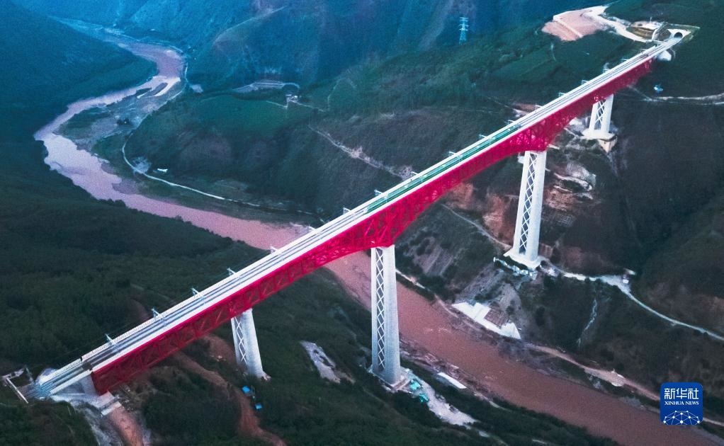 中老鐵路首發(fā)列車駛過中國云南省元江哈尼族彝族傣族自治縣境內(nèi)的元江雙線特大橋(2021年12月3日攝,無人機照片)。新華社記者 王冠森 攝
