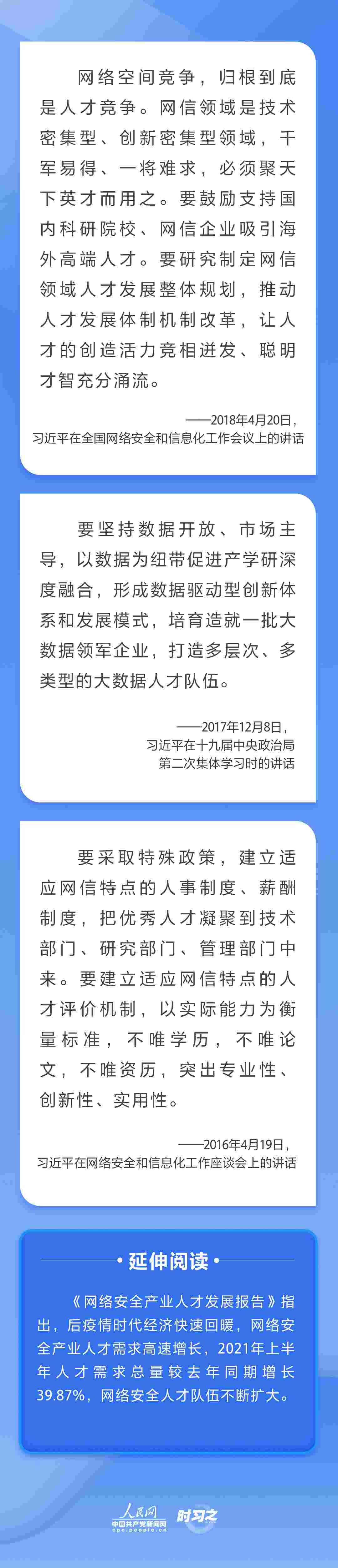 “網(wǎng)信領(lǐng)域是技術(shù)密集型、創(chuàng)新密集型領(lǐng)域,千軍易得、一將難求,必須聚天下英才而用之。”黨的十八大以來,習(xí)近平總書記多次就網(wǎng)信事業(yè)發(fā)展作出重要論述,并將抓好人才工作擺在治國理政的重要位置,為新時代網(wǎng)信人才工作和網(wǎng)信人才事業(yè)發(fā)展指明了前進方向。