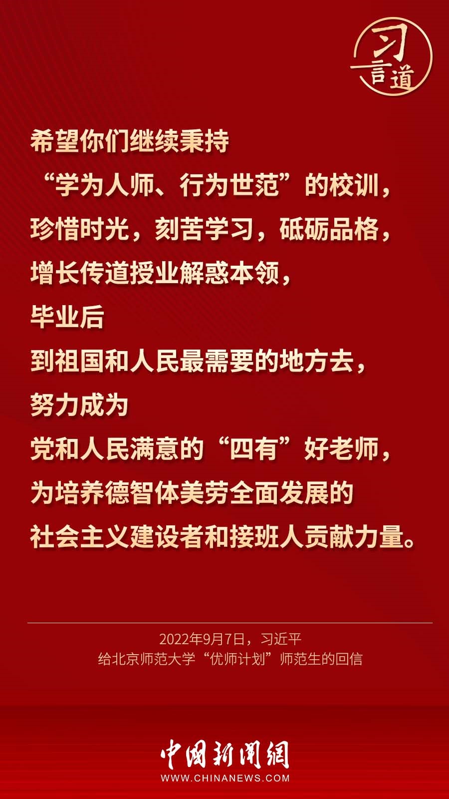 9月7日,習(xí)近平總書記回信勉勵(lì)北京師范大學(xué)“優(yōu)師計(jì)劃”師范生,努力成為黨和人民滿意的“四有”好老師。十八大以來,習(xí)近平多次通過書信的形式,對(duì)教師群體寄予殷切期望。