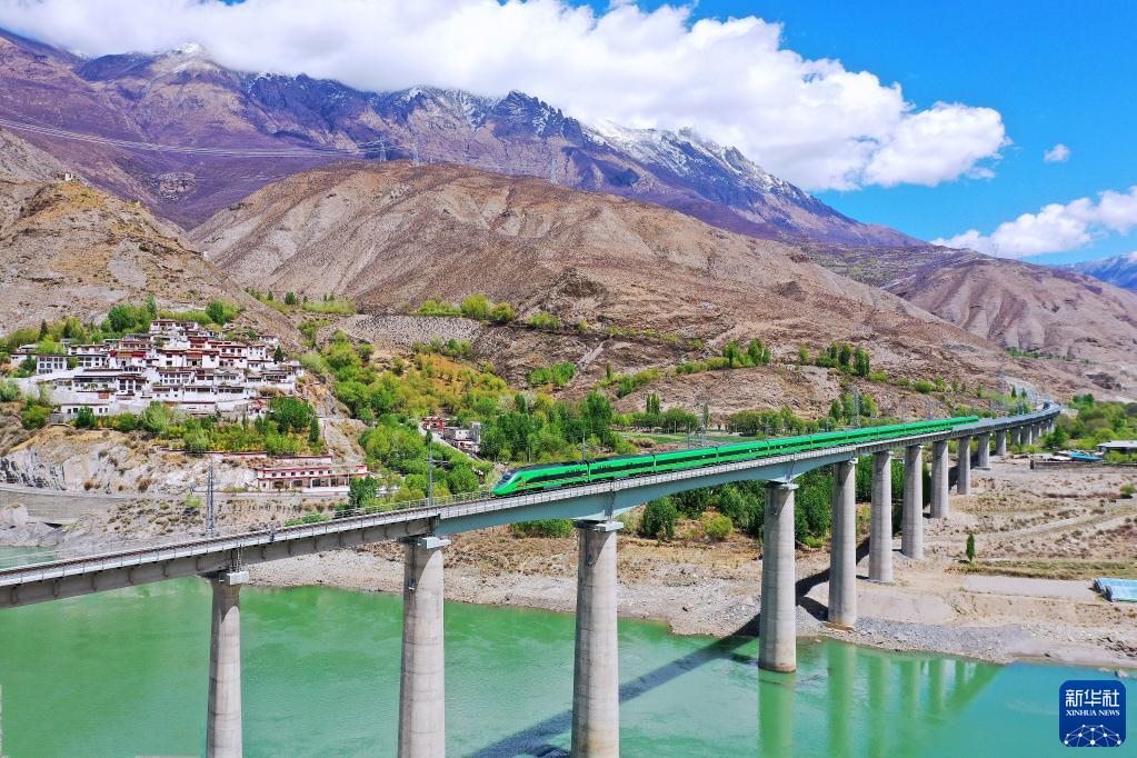 復興號列車行駛在西藏朗縣境內(nèi)(2022年4月14日攝)。新華社記者 覺果 攝