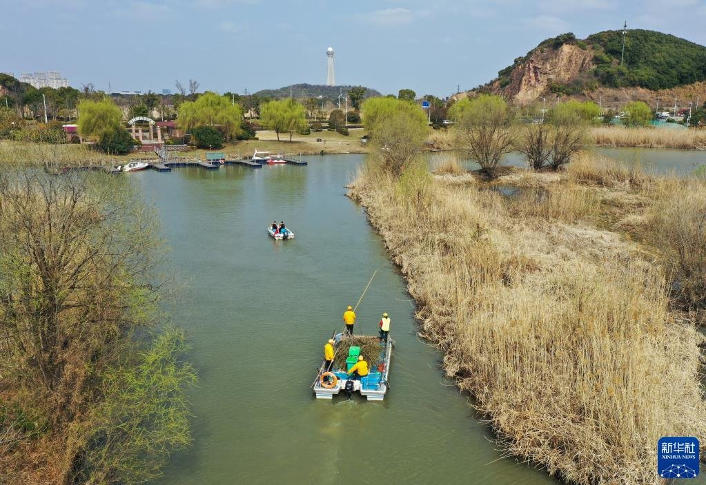 浙江省湖州市吳興區(qū)八里店鎮(zhèn)移沿山村河長帶隊在移沿山村開展巡河、保潔作業(yè)(2021年2月24日攝,無人機照片)。新華社記者 翁忻旸 攝