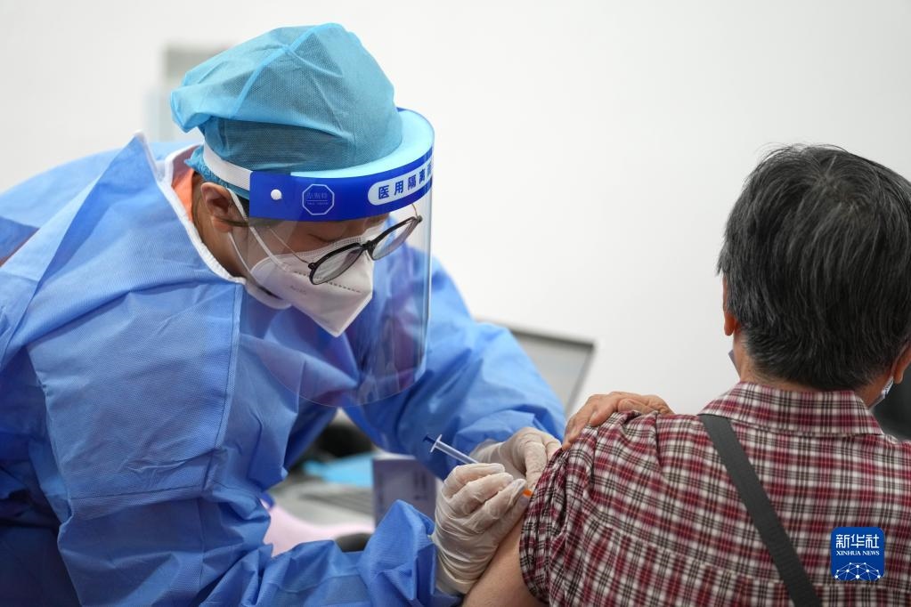在北京市朝陽區(qū)奧運(yùn)村街道一處新冠疫苗接種點(diǎn),醫(yī)護(hù)人員為一市民接種新冠疫苗加強(qiáng)針(2022年7月13日攝)。新華社記者鞠煥宗攝