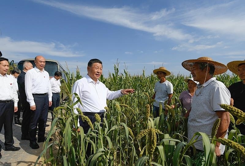 △2021年9月13日,習近平總書記在陜西米脂縣高西溝村臨時下車,察看糧食作物長勢,同正在田間勞作的老鄉(xiāng)拉家常。