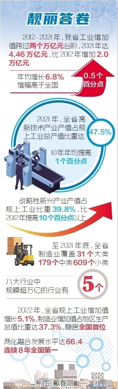 制造業(yè)規(guī)模實(shí)力保持領(lǐng)先。我省把制造業(yè)高質(zhì)量發(fā)展擺在更加突出位置,加快傳統(tǒng)產(chǎn)業(yè)轉(zhuǎn)型和戰(zhàn)略性新興產(chǎn)業(yè)發(fā)展,推進(jìn)產(chǎn)業(yè)邁向中高端水平。工業(yè)增加值10年跨過3萬(wàn)億、4萬(wàn)億兩個(gè)臺(tái)階,2021年達(dá)4.46萬(wàn)億元,比2012年增加2.0萬(wàn)億元,年均增長(zhǎng)6.8%,增幅高于全國(guó)0.5個(gè)百分點(diǎn)。