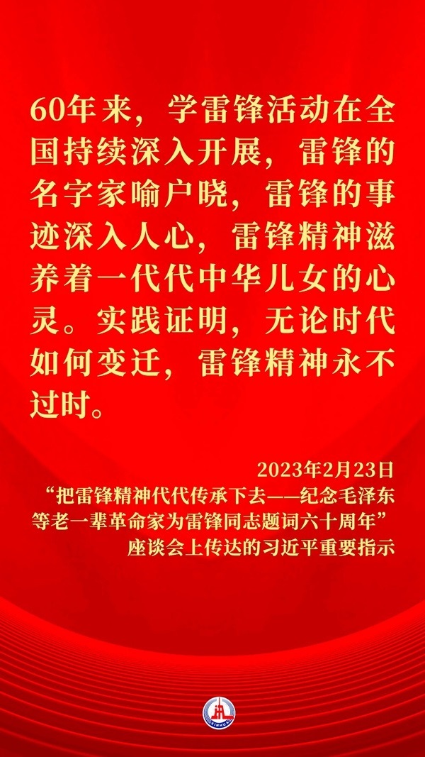 “60年來(lái),學(xué)雷鋒活動(dòng)在全國(guó)持續(xù)深入開展,雷鋒的名字家喻戶曉,雷鋒的事跡深入人心,雷鋒精神滋養(yǎng)著一代代中華兒女的心靈?!绷?xí)近平總書記近日對(duì)深入開展學(xué)雷鋒活動(dòng)作出重要指示。