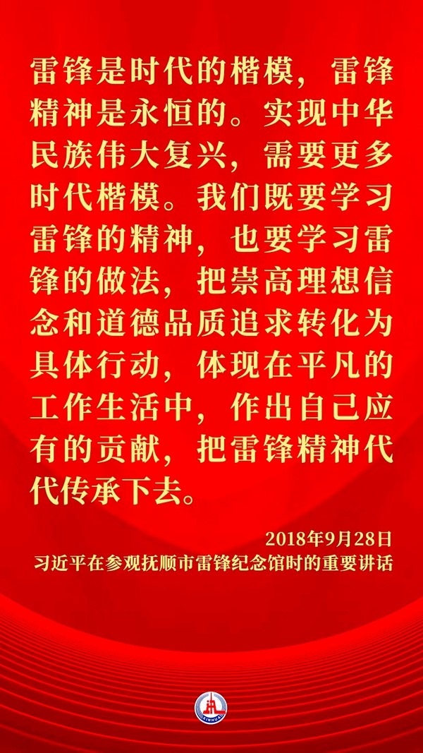 “雷鋒是時(shí)代的楷模,雷鋒精神是永恒的。實(shí)現(xiàn)中華民族偉大復(fù)興,需要更多時(shí)代楷模?!绷?xí)近平總書記的號(hào)召,喚起億萬(wàn)人奮斗與堅(jiān)守。新時(shí)代,雷鋒精神是持續(xù)激發(fā)崇德向善的磅礴偉力;新時(shí)代“雷鋒”,在新征程上頑強(qiáng)拼搏,匯聚起共和國(guó)奔騰向前的時(shí)代潮流!