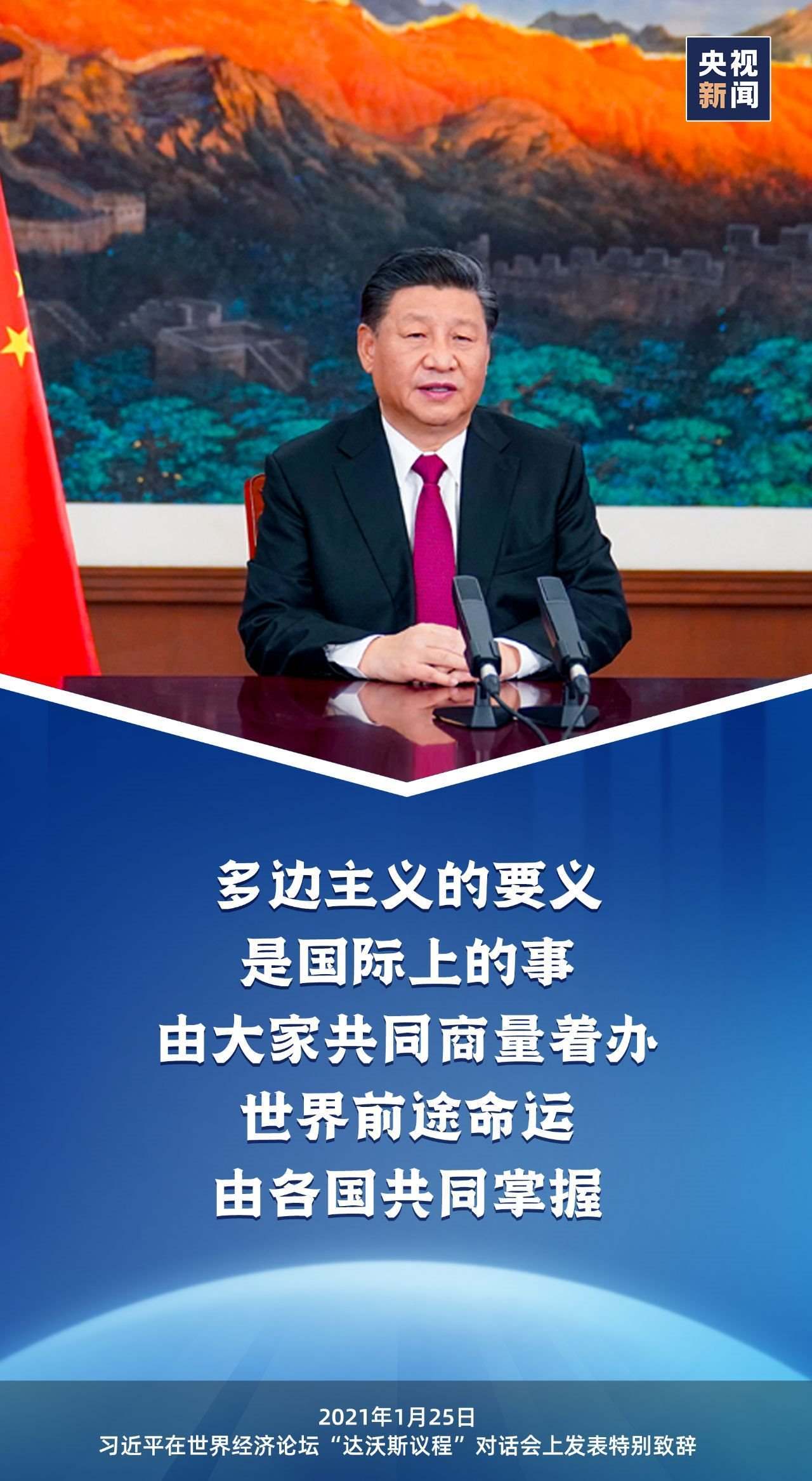 在2021年1月召開的世界經(jīng)濟論壇“達沃斯議程”對話會上,習(xí)近平主席發(fā)表特別致辭,再次強調(diào)踐行多邊主義,并指出“多邊主義的要義是國際上的事由大家共同商量著辦”。