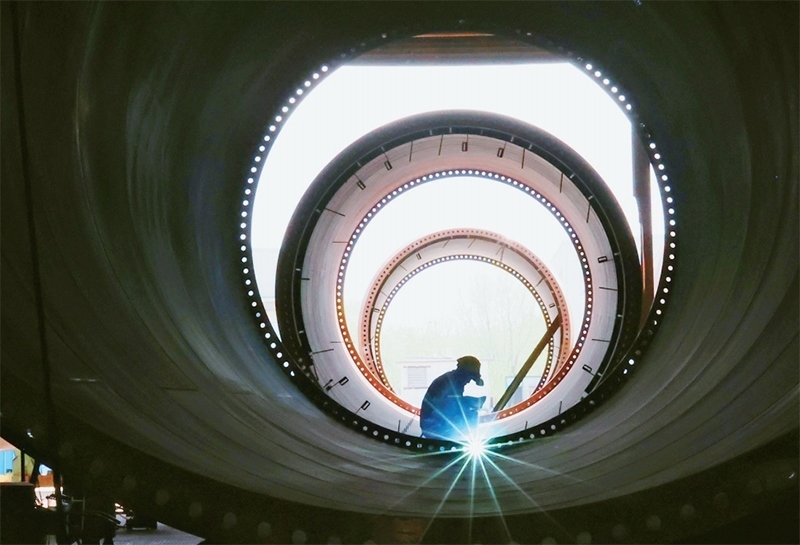 2023年一季度,我國(guó)國(guó)內(nèi)生產(chǎn)總值同比增長(zhǎng)4.5%,國(guó)民經(jīng)濟(jì)開(kāi)局良好,為實(shí)現(xiàn)全年發(fā)展目標(biāo)奠定了基礎(chǔ),注入了信心。圖為2023年4月18日,工人在江蘇連云港經(jīng)濟(jì)技術(shù)開(kāi)發(fā)區(qū)一家公司內(nèi)加工組裝風(fēng)電塔筒。 中新社發(fā) 耿玉和/攝