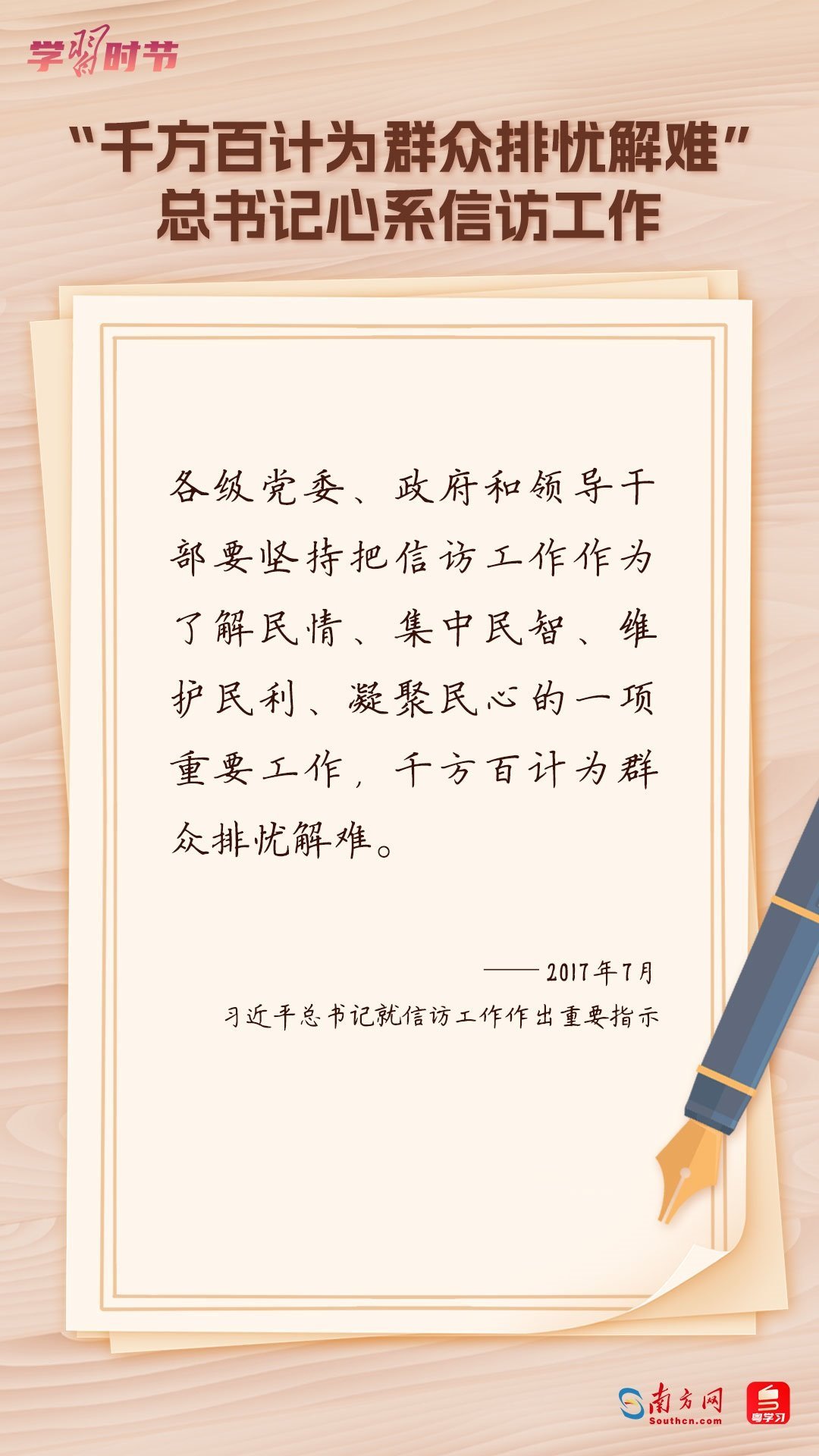 2022年5月1日,中共中央、國務院印發(fā)的《信訪工作條例》正式實施?!缎旁L工作條例》以習近平新時代中國特色社會主義思想為指導,深入貫徹習近平總書記關(guān)于加強和改進人民信訪工作的重要思想,總結(jié)黨長期以來領(lǐng)導和開展信訪工作經(jīng)驗特別是黨的十八大以來信訪工作制度改革成果,堅持和加強黨對信訪工作的全面領(lǐng)導,理順信訪工作體制機制,是新時代信訪工作的基本遵循。今年5月1日是《信訪工作條例》實施一周年,“學習時節(jié)”整理摘錄習近平總書記關(guān)于信訪工作的重要講話和重要指示批示,與您一同學習。
