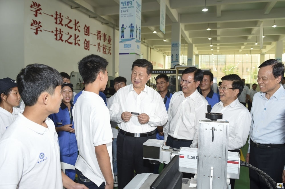 2015年6月17日,習(xí)近平在貴州省機(jī)械工業(yè)學(xué)校實(shí)訓(xùn)基地勉勵(lì)學(xué)生加強(qiáng)操作訓(xùn)練、不斷取得優(yōu)異成績。