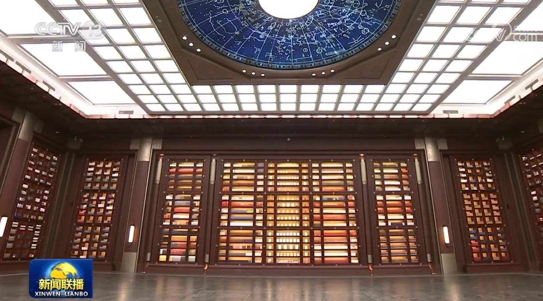 走進(jìn)國(guó)家書(shū)房,映入眼簾的是44個(gè)巨型書(shū)柜,抬頭可見(jiàn)宋代石刻天文圖的星空穹頂,四周由10根木柱造型營(yíng)造出空間的序列感,每個(gè)柱頭的祥云牡丹端莊秀雅,柱礎(chǔ)的江崖海水則體現(xiàn)了中國(guó)古代藏書(shū)閣必備的以水鎮(zhèn)火的寓意。