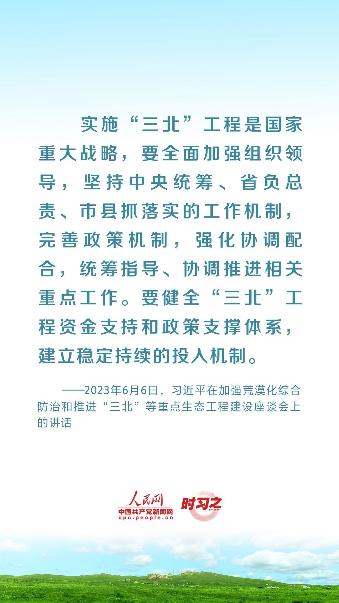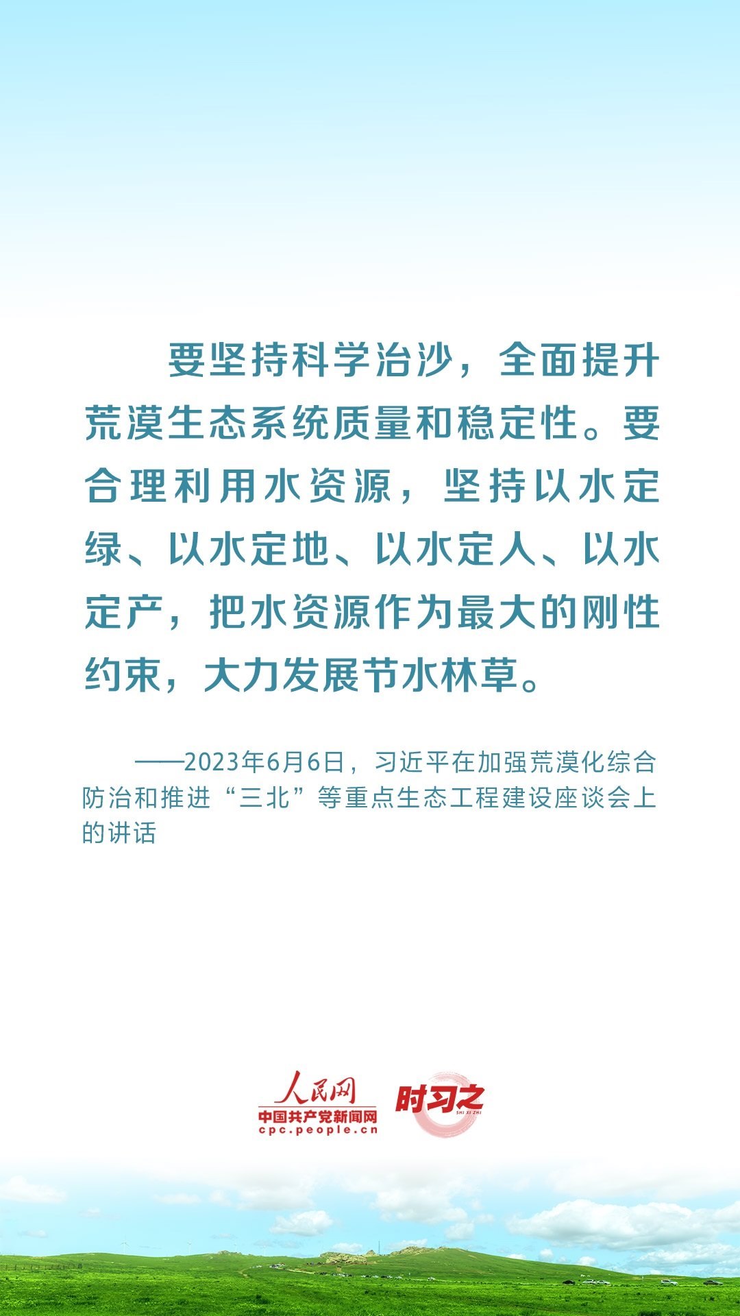 2023年6月5日至6日,中共中央總書記、國家主席、中央軍委主席習(xí)近平在內(nèi)蒙古自治區(qū)巴彥淖爾市考察,主持召開加強(qiáng)荒漠化綜合防治和推進(jìn)“三北”等重點(diǎn)生態(tài)工程建設(shè)座談會(huì)并發(fā)表重要講話。座談會(huì)上,習(xí)近平對走好中國特色防沙治沙道路提出工作要求。