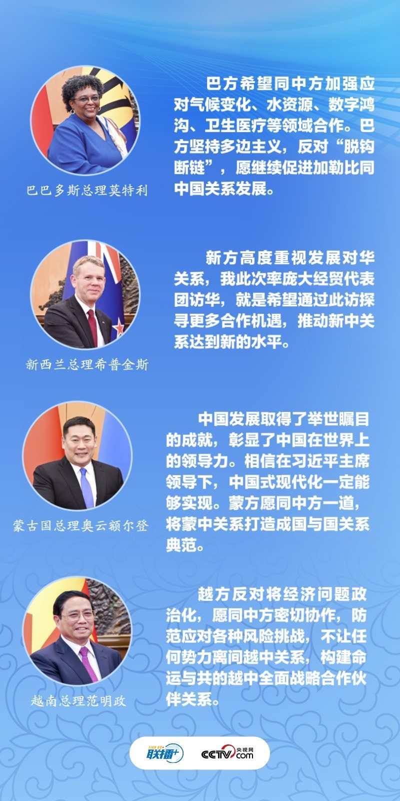巴巴多斯總理莫特利直言“通過(guò)此訪深切感受到巴中之間的團(tuán)結(jié)與友好”;蒙古國(guó)總理奧云額爾登希望“將蒙中關(guān)系打造成國(guó)與國(guó)關(guān)系典范”;越南總理范明政堅(jiān)定表示“不讓任何勢(shì)力離間越中關(guān)系”;中新關(guān)系長(zhǎng)期“領(lǐng)跑”中國(guó)同發(fā)達(dá)國(guó)家關(guān)系,新西蘭總理希普金斯希望此訪能進(jìn)一步推動(dòng)雙方合作……6月27日的四場(chǎng)雙邊會(huì)見(jiàn)中,幾位外方領(lǐng)導(dǎo)人不約而同對(duì)擴(kuò)大加深雙邊合作充滿信心。