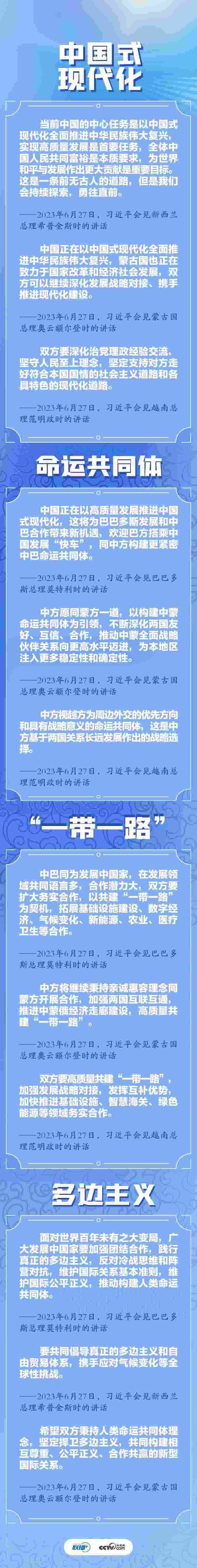 央視網(wǎng)《聯(lián)播+》梳理發(fā)現(xiàn),四場(chǎng)雙邊會(huì)見(jiàn)中,“中國(guó)式現(xiàn)代化”“命運(yùn)共同體”“一帶一路”“多邊主義”四個(gè)關(guān)鍵詞頻繁出現(xiàn)。