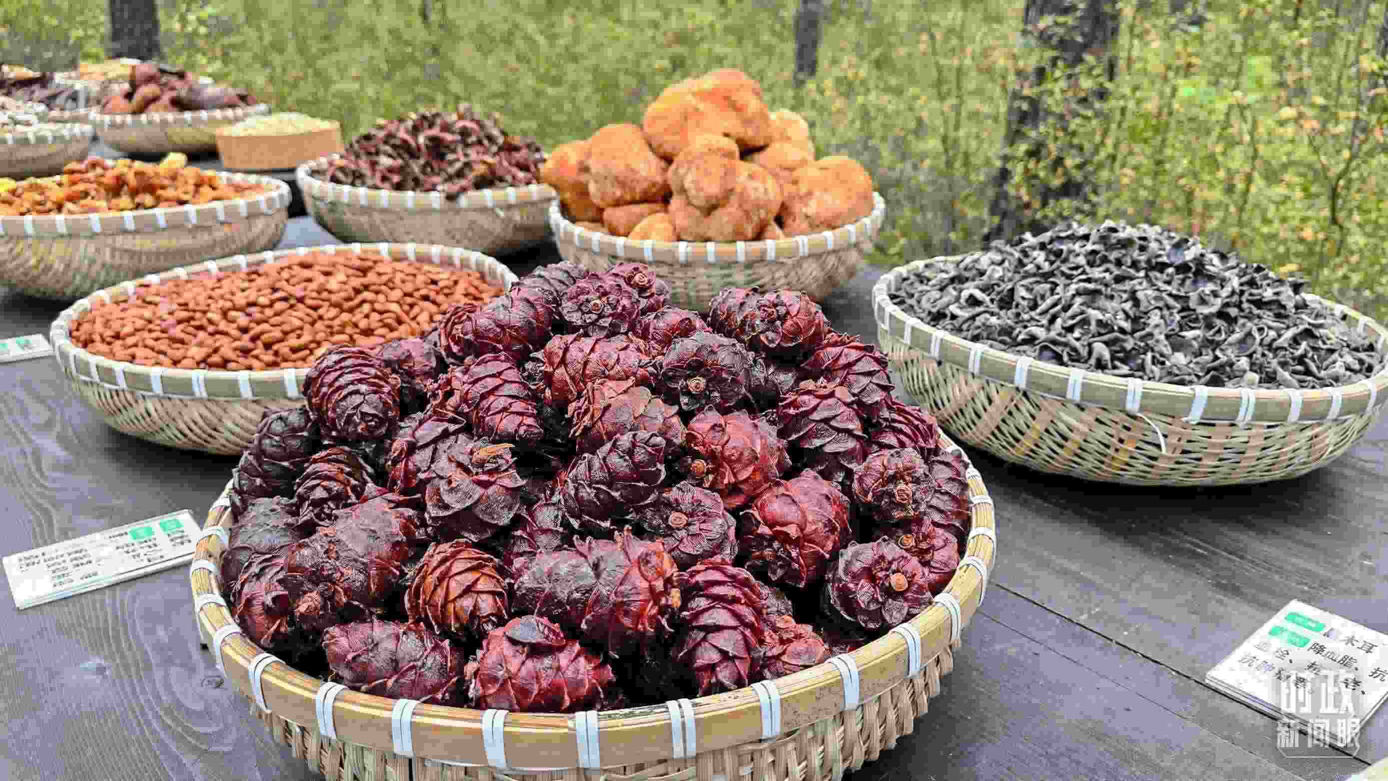 △漠河林場自然林區(qū)的林下作物展示,最靠近鏡頭的是偃松塔。(總臺央視記者楊立峰拍攝)