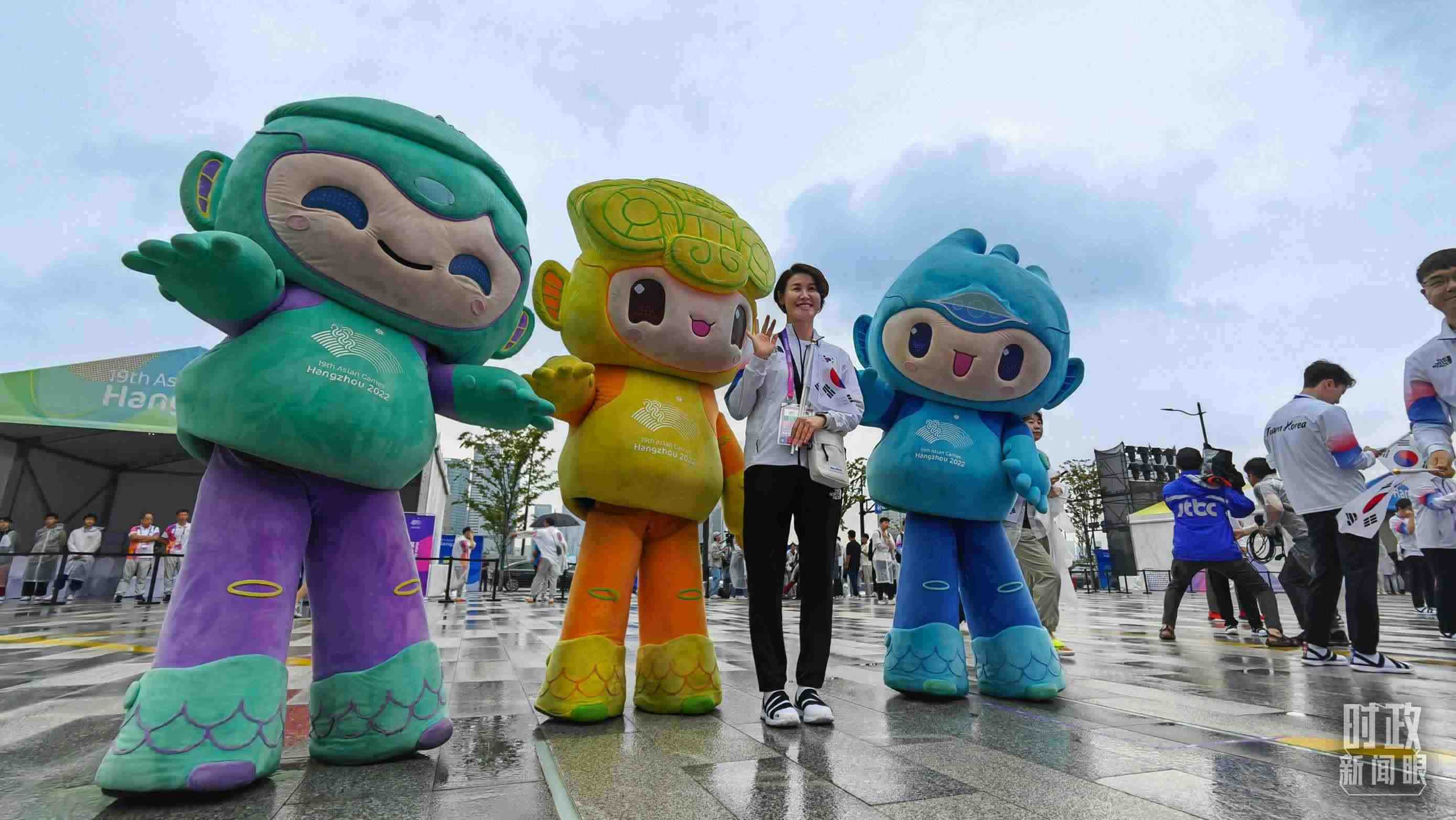 △亞運(yùn)村為各代表團(tuán)舉行歡迎儀式,隊(duì)員們紛紛與吉祥物“蓮蓮”、“琮琮”、“宸宸”合影。(總臺央視記者陳偉奎拍攝)