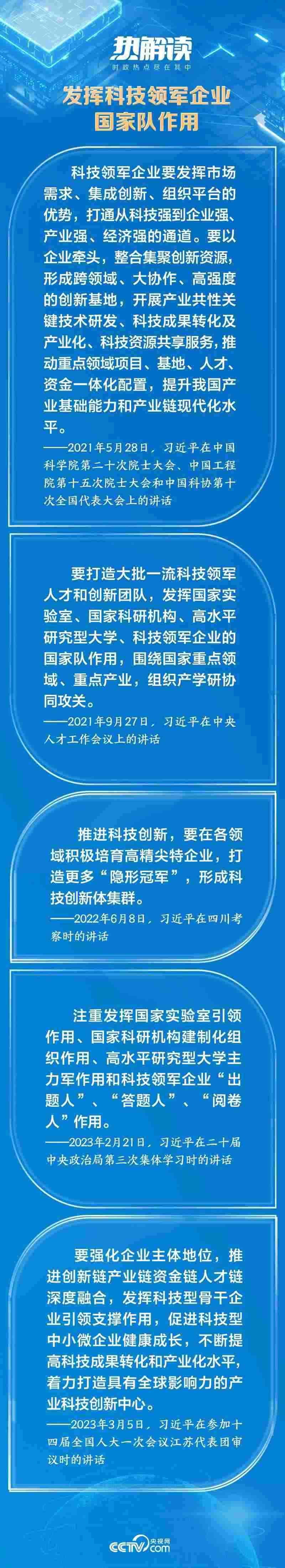 企業(yè)是市場的主體,是推動科技創(chuàng)新的生力軍。作為國家戰(zhàn)略科技力量的重要組成部分,總書記對科技領(lǐng)軍企業(yè)更是寄予厚望:“要自覺履行高水平科技自立自強的使命擔(dān)當(dāng)”,要注重發(fā)揮“科技領(lǐng)軍企業(yè)‘出題人’、‘答題人’、‘閱卷人’作用”。