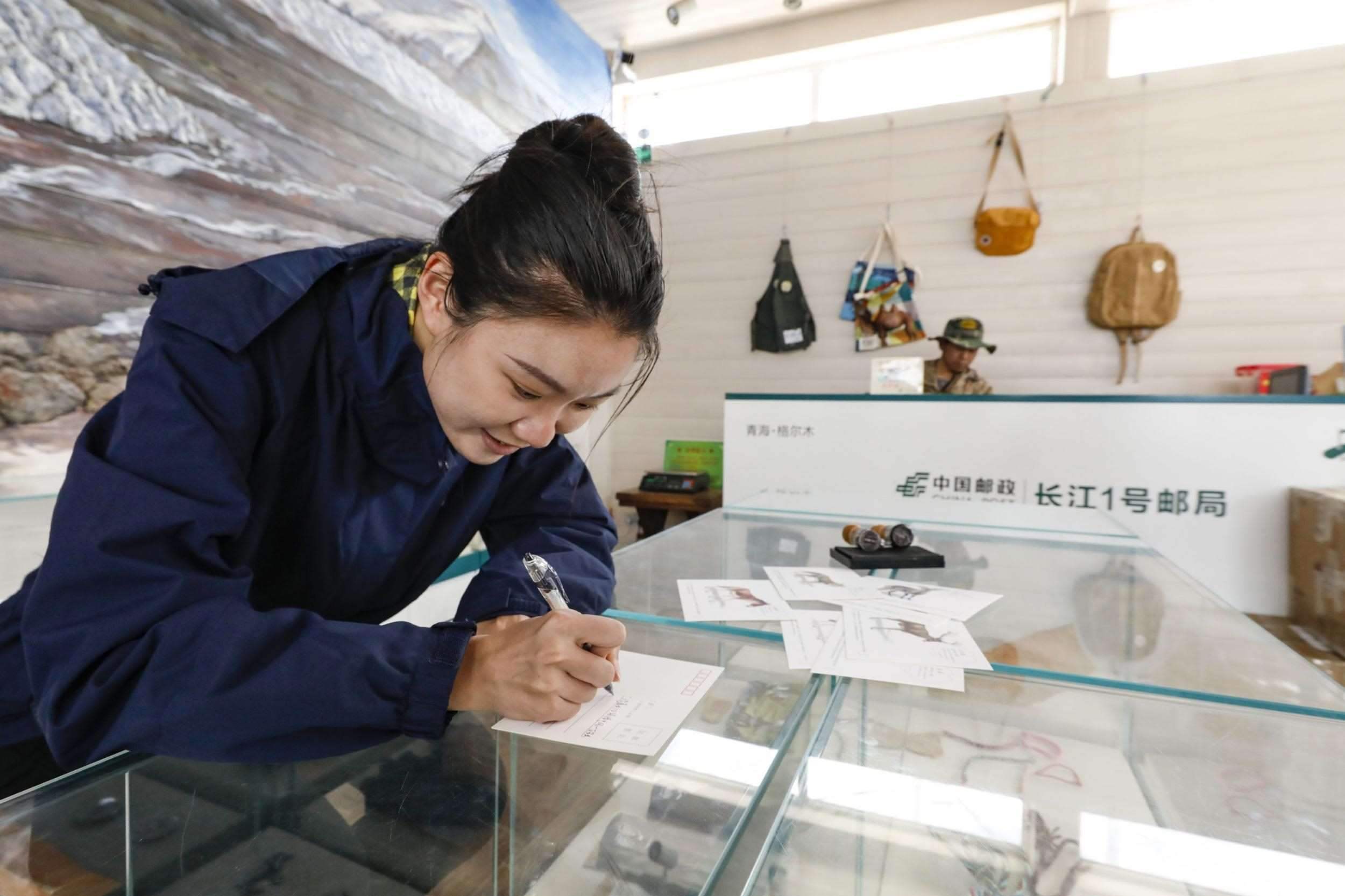 2023年7月23日,在“長江1號(hào)”郵局,一名女士郵寄長江生態(tài)保護(hù)主題明信片。王箏 攝