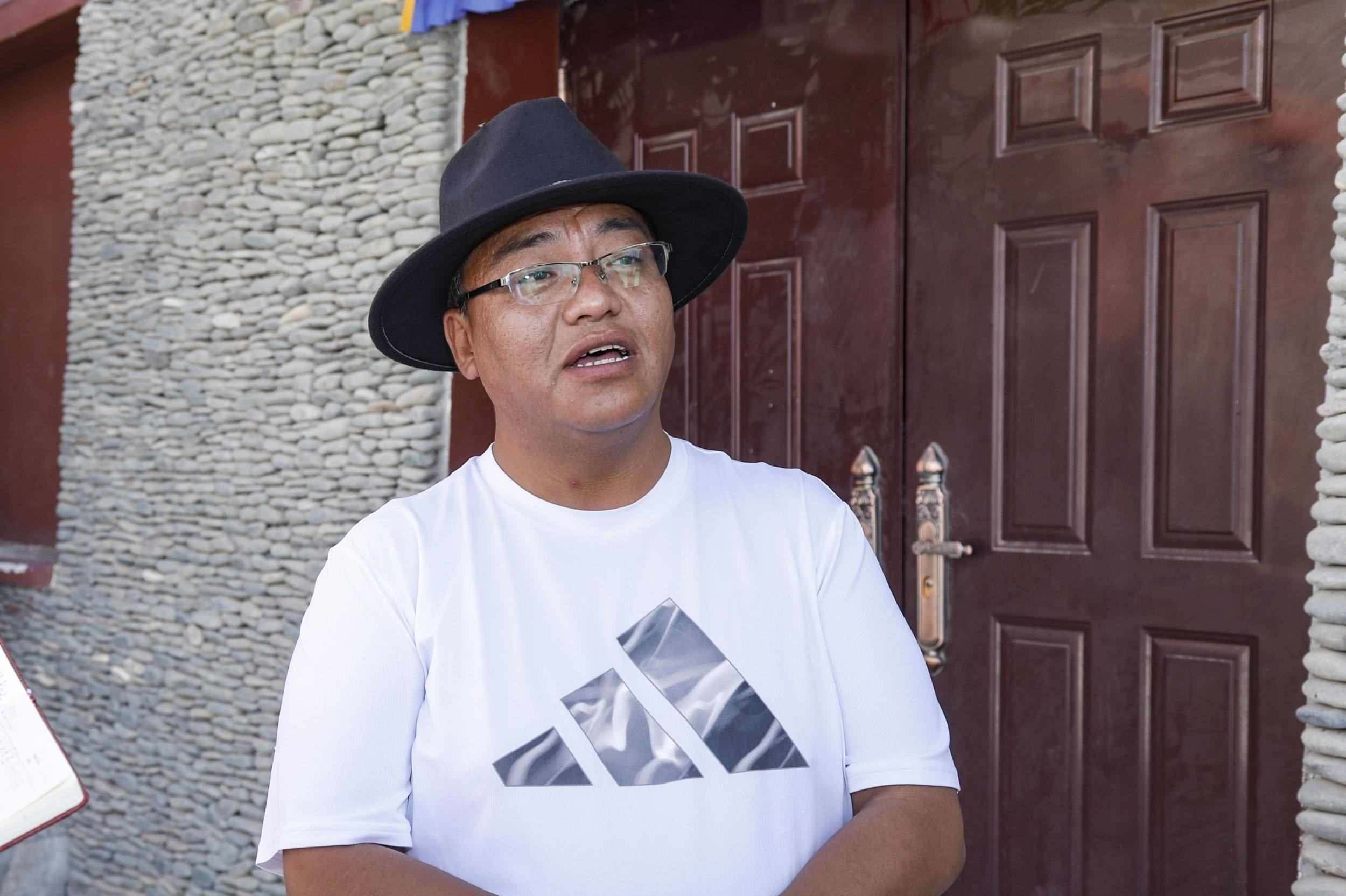 2023年7月22日,在長江源村文化廣場前,唐古拉山鎮(zhèn)黨委書記索南東主分享他參與長江生態(tài)保護(hù)的心得。王箏 攝