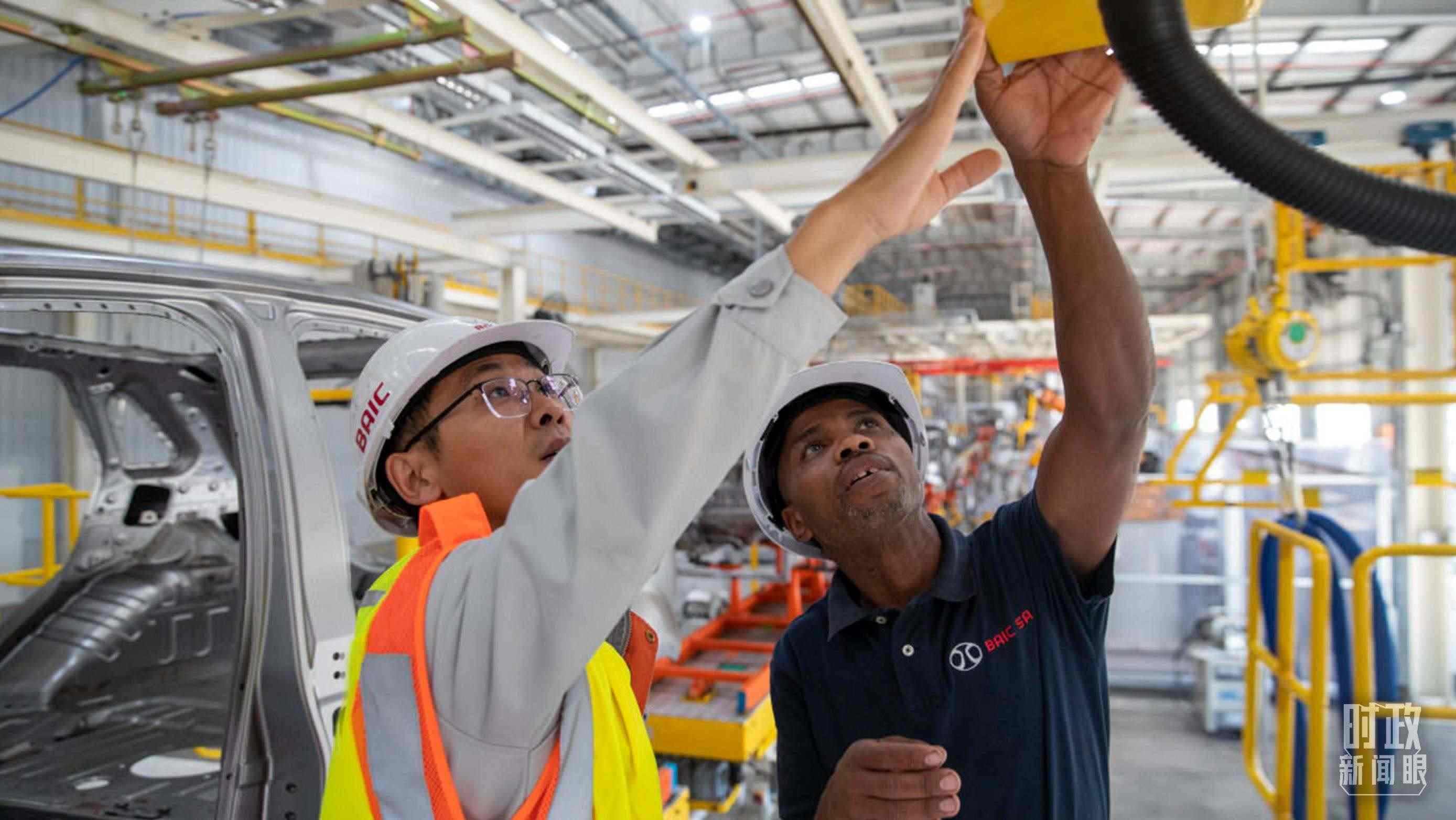 △在南非東開普省北汽南非工廠,當?shù)貑T工與中國同事在焊裝車間內(nèi)工作。(資料圖)