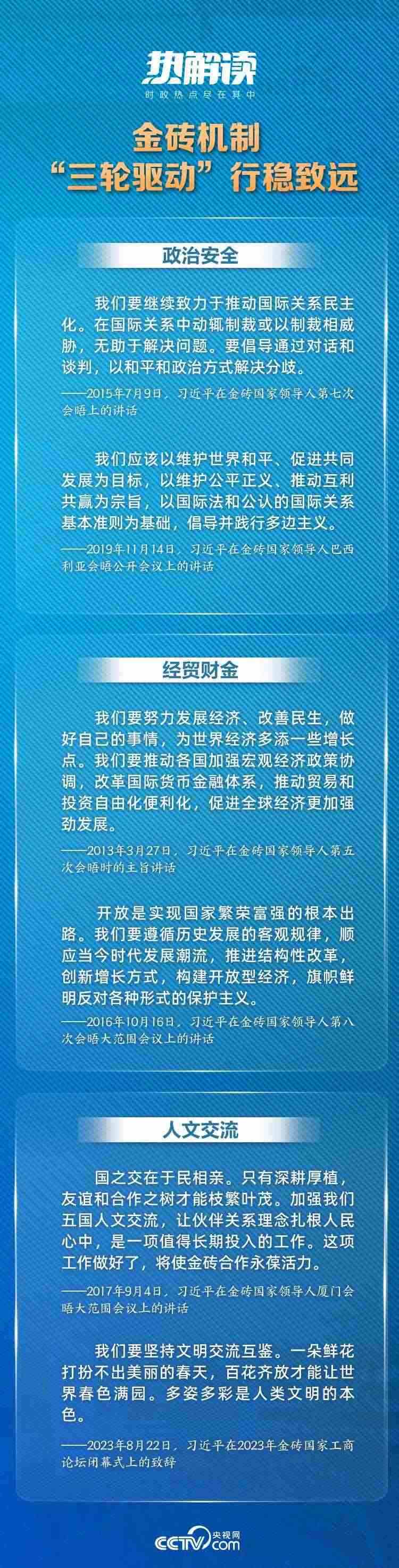 從字母組合的符號(hào)象征到一塊實(shí)打?qū)嵉摹敖鸫u”,回顧金磚合作機(jī)制走過的歷程,習(xí)近平主席倡導(dǎo)的“三輪驅(qū)動(dòng)”合作架構(gòu)為金磚國家合作發(fā)展提供了可行有效的抓手。